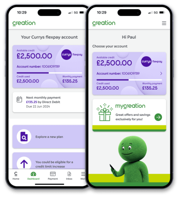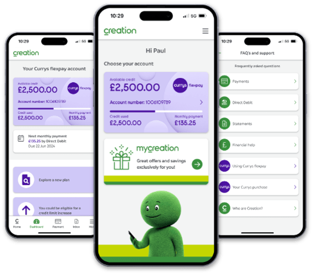 When you open a Currys flexpay account, you can manage it with your personal Online Account Manager, or the Creation Finance App, which you can access 24/7, get the latest information about your account, make changes to suit your needs, or make a new additional purchase.